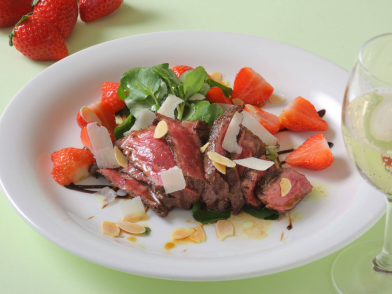 レアに焼き上げた希少部位のイチボの濃厚な旨みとイチゴの相性が抜群です。