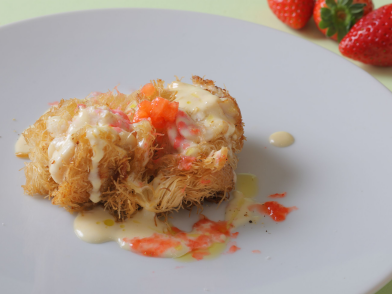 白子のカダイフ巻き ~タレッジョとイチゴのピエモンテ風フォンデュータ~