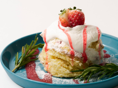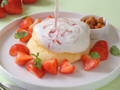 ふんわり焼き上げたパンケーキの上に苺マーブルクリームをおかけいたします。苺のクランブルが食感のアクセントに。