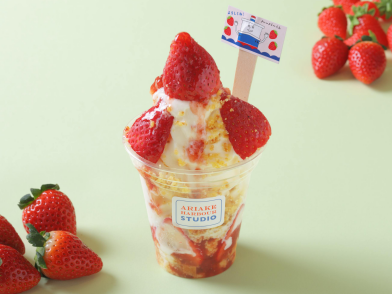 とろけるクリームのうえに、甘酸っぱいフレッシュないちごと、いちごソースでデコレーション。”すくって食べる”スタイルの華やかなショートケーキです。