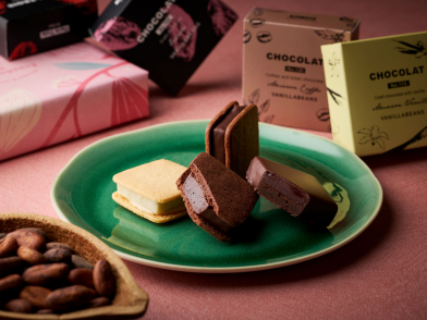 華やかな味わいのアリバカカオのフレーバーをはじめ、エクアドル産の素材を生かしたチョコレートを仕立てました。生チョコレートのクッキーサンドとプチショコラケーキのアソートです。