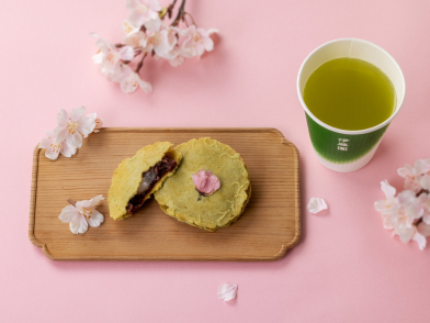 さくら餅のような上品な香りが広がるさくらの緑茶と、さくら葉記事に小倉あんと求肥を挟んだ生菓子(御縁の桜)のセット。